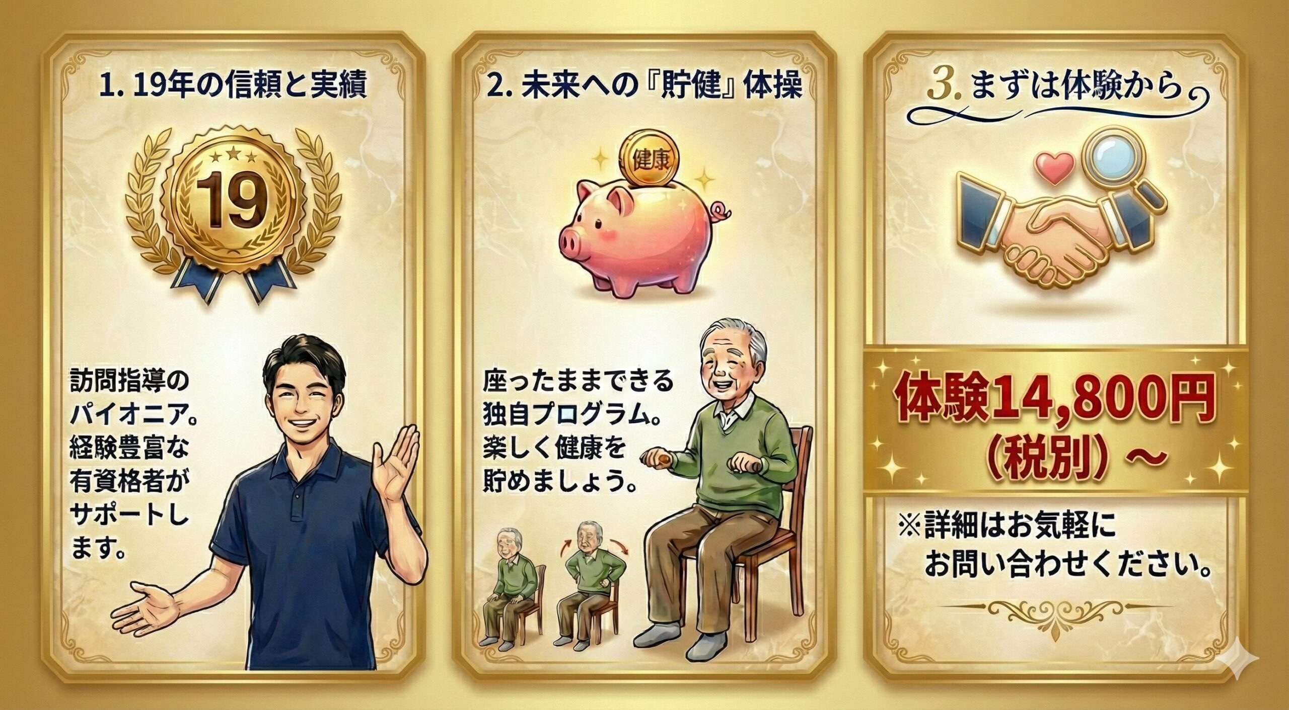 1. 19年の体操指導経験!介護施設とパーソナルトレーニングのエキスパートが対応