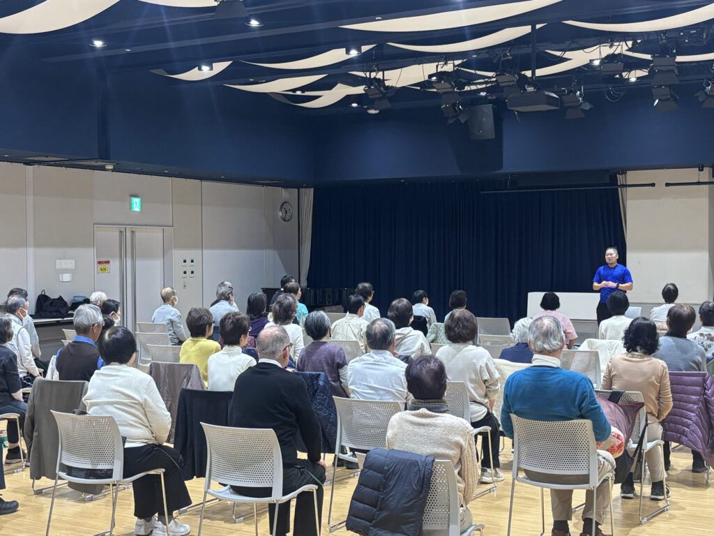 老人福祉センター様からのご依頼により、敬老週間の催しとしてセラバンドを用いたトレーニングを実施いたしました。 当日は約30名の皆さまにご参加いただき、温かな雰囲気の中、和やかに体操を行うことができました。 同センターでは以前より、私のDVDを活用したセラバンド体操を定期的に実施されており、継続的な取り組みの一環としてご活用いただいております。 併せて、DVDを用いた体操を実施されていることは伺っておりましたが、今回、実際の現場で皆さまとご一緒に体操をさせていただき、現場ならではの学びが多く、大変考えさせられる貴重な機会となりました。DVDを通じて体操の輪が広がっていることを拝見し、制作者として心からうれしく、今後の活動の励みになりました。 今後とも、皆さまの健康づくりのお手伝いができれば幸いです。
