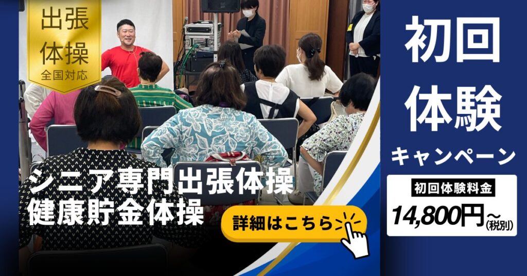 出張体操を初めてご利用の方には、14,800円(税別)~+交通費で体験していただけます。自治体や介護施設、老人ホーム、イベント会社、パーソナルトレーニングの方々にも多数の実績がありますので、ぜひご体験ください。