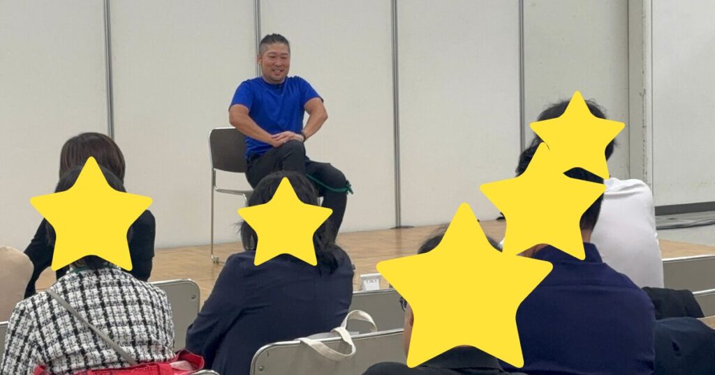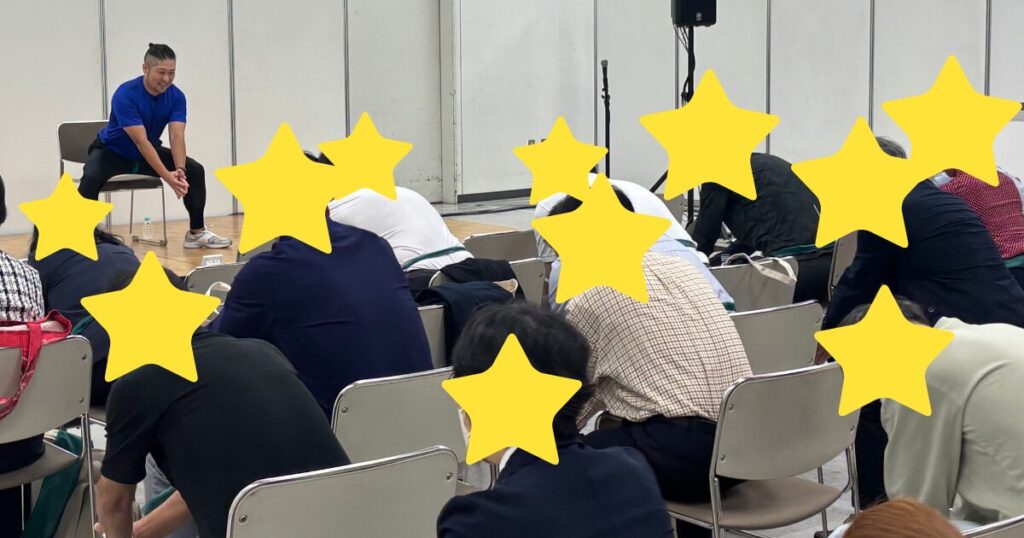 2025年10月9日、新宿NSビルで開催された「シニアしごとエキスポ2025」にて、ちょけん先生が出張体操を実施しました。テーマは「元気に長く暮らす!明るく楽しいちょけん体操」。約40名が参加し、セラバンドを使った上半身・下半身の筋力トレーニングを体験。椅子に座ったままできる動きを中心に、無理なく続けられる健康づくりを紹介しました。