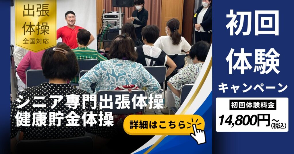出張体操を初めてご利用の方には、14,800円(税込)~+交通費で体験していただけます。自治体や介護施設、老人ホーム、イベント会社、パーソナルトレーニングの方々にも多数の実績がありますので、ぜひご体験ください。