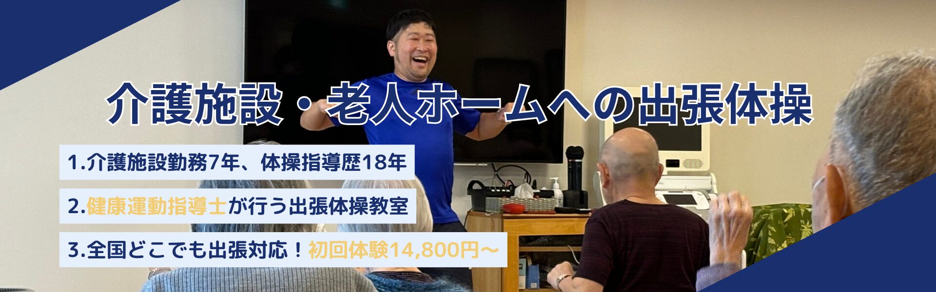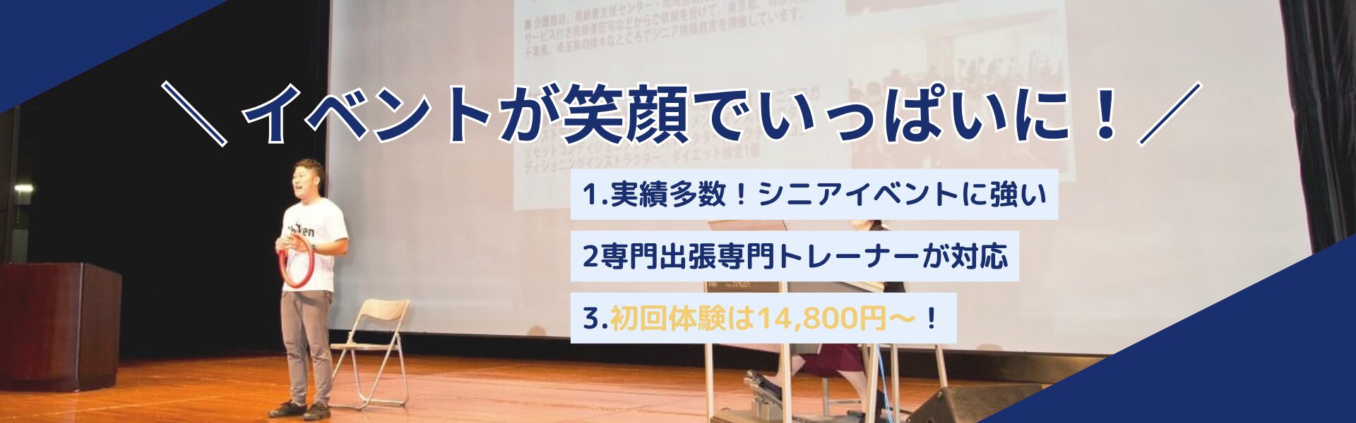 出張体操を初めてご利用の方には、14,800円(税込)~+交通費で体験していただけます。自治体や介護施設、老人ホーム、イベント会社、パーソナルトレーニングの方々にも多数の実績がありますので、ぜひご体験ください。