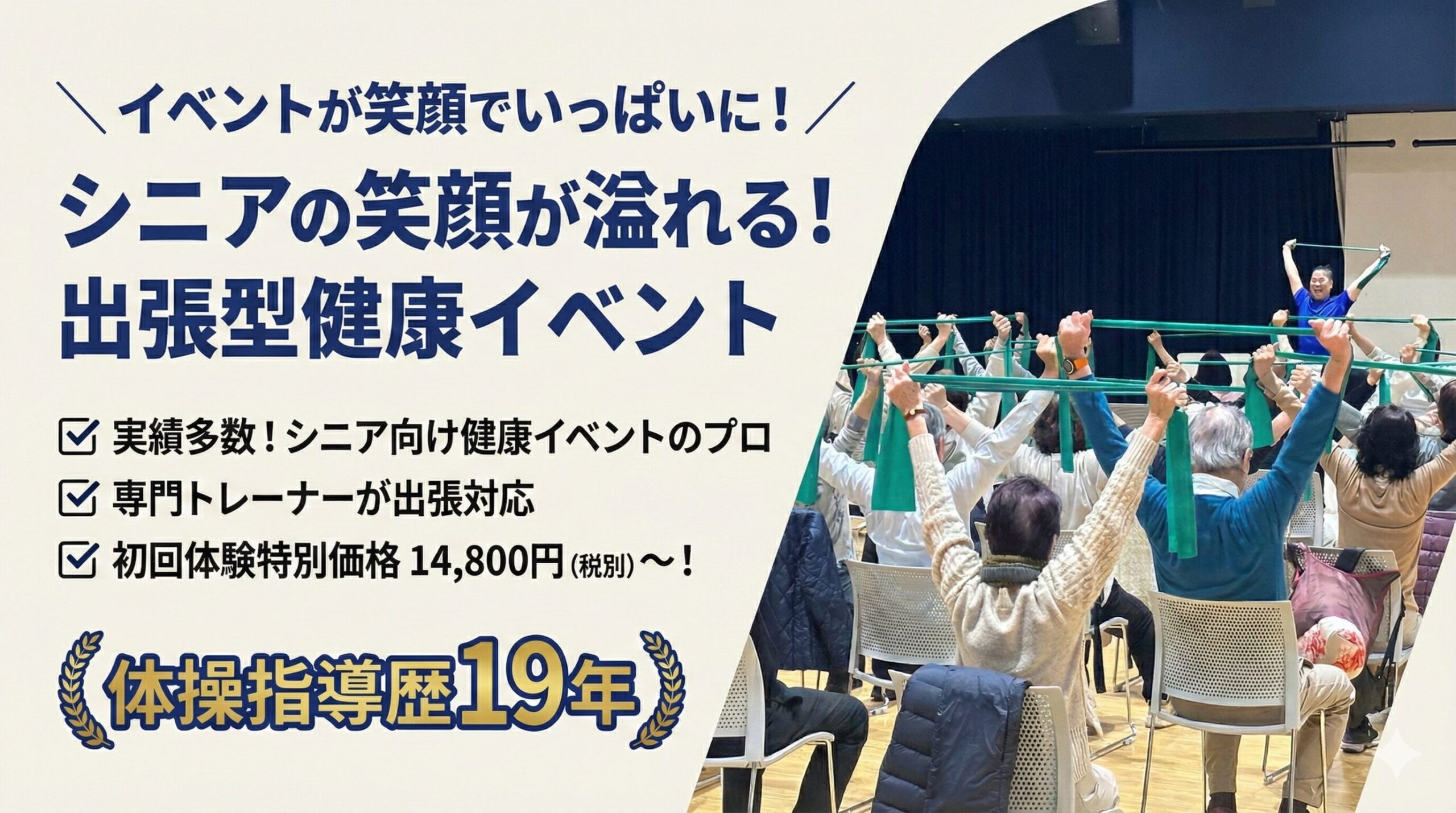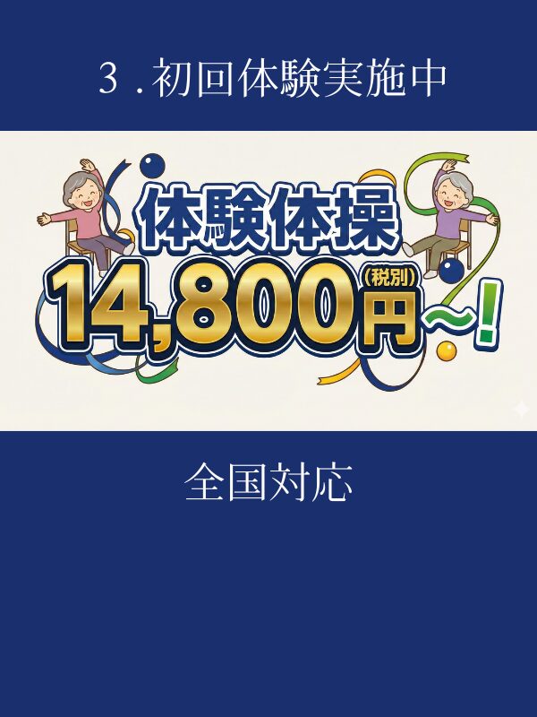 出張体操を初めてご利用の方には、14,800円(税別)~+交通費で体験していただけます。自治体や介護施設、老人ホーム、イベント会社、パーソナルトレーニングの方々にも多数の実績がありますので、ぜひご体験ください。