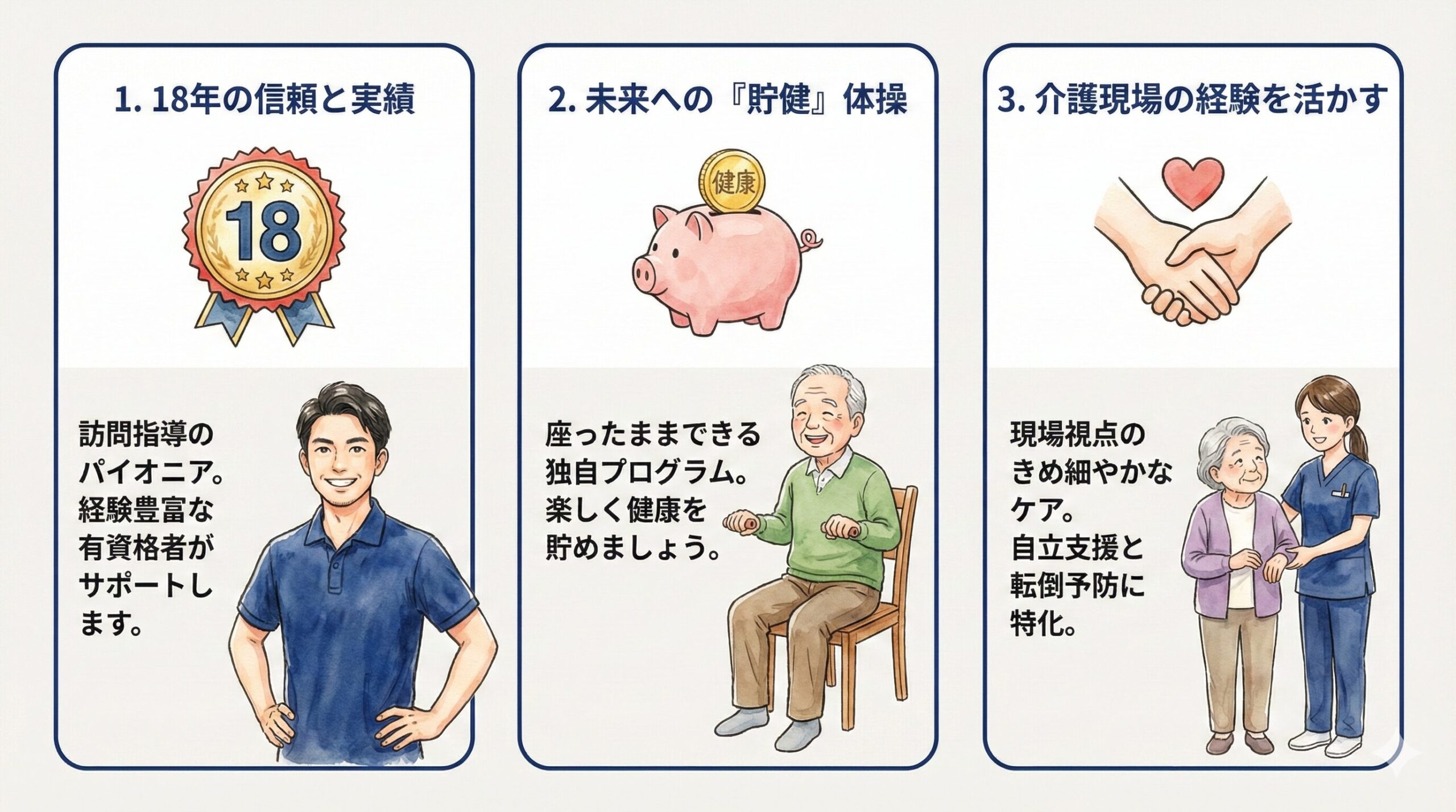 1. 18年の体操指導経験!介護施設とパーソナルトレーニングのエキスパートが対応
