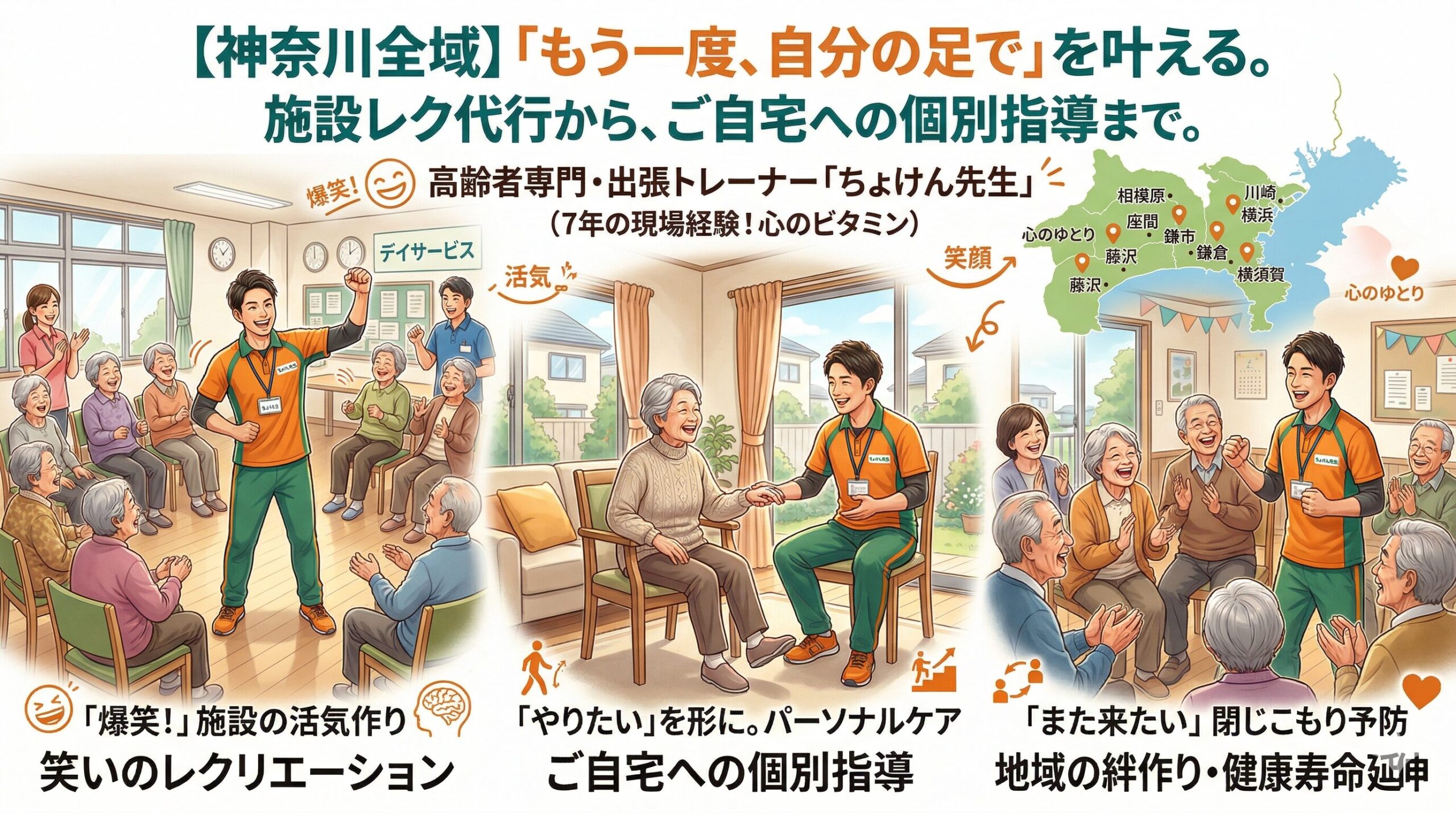 【神奈川全域】「もう一度、自分の足で」を叶える。介護施設のレク代行からご自宅への出張個別指導まで、ちょけん先生にお任せ!
